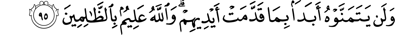 - walan yatamannawhu abadan bima qaddamat aydeehim waallahu aaaleemun bialththalimeena <> kuma ba za su yi gurinta bahar abada saboda abin da hannayensu, suka gabatar. kuma allah masani ne ga azzalumai. = [ 2:95 ] ba za suyi fatan shi ba, saboda hannuwan suka aika da shi, allah ma sani ne ga dukkan azzalumai. --Qur'an 2:95
